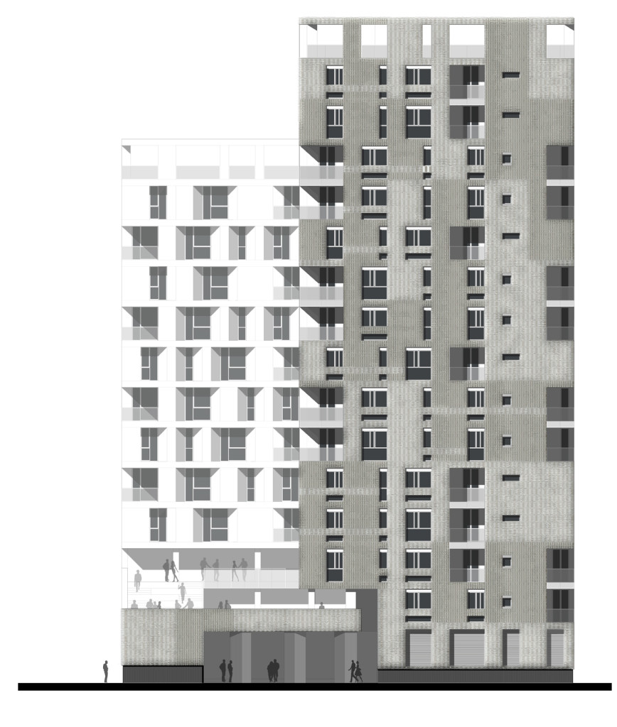 Arranged according to the orthogonal grid that unites the entire project, the volumes are offset to avoid overlapping of the facades, also to facilitate the passage of light to the open spaces behind them, so drawing a thin piece of sky that features the skyline and emphasizes the transition from intimate spaces to the city. The ground floors leads the building to human scale and defines a porch that welcomes flows and strengthens the relationship between the building and open spaces, generating a thick threshold.